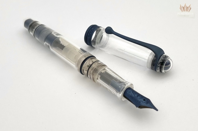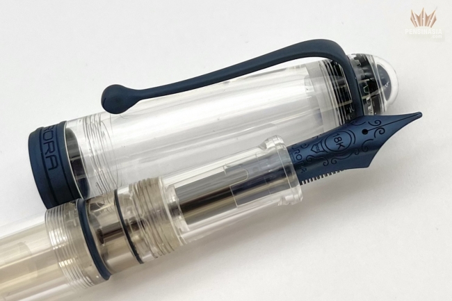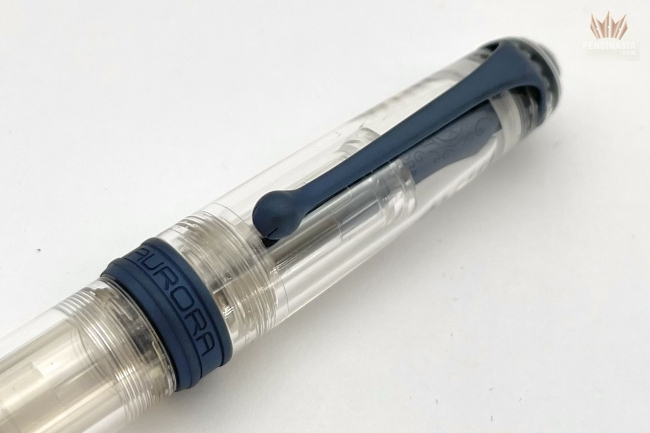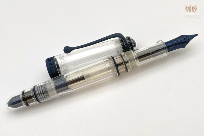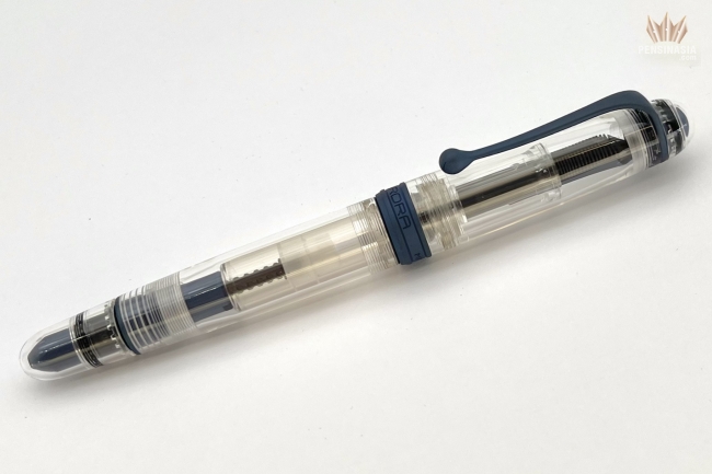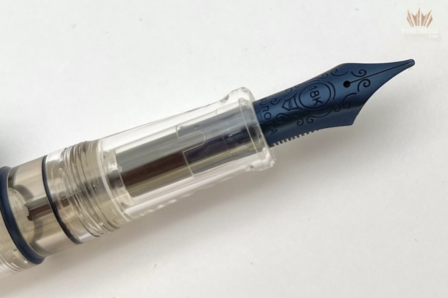 The pen has an 18 kt solid gold nib, coated with a blue PVD coating, and uses a piston filling mechanism.