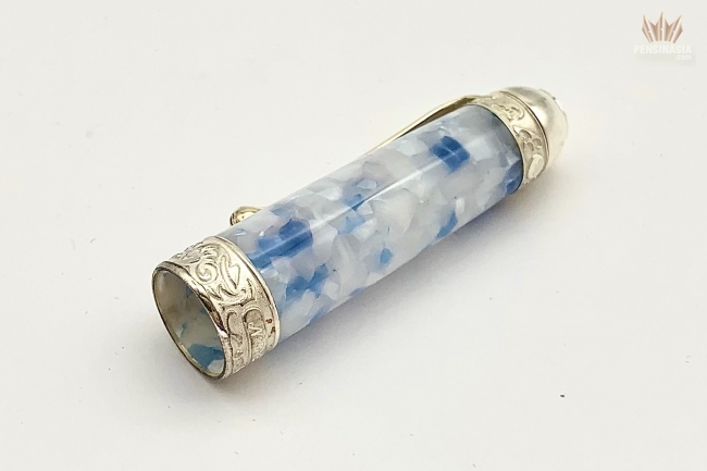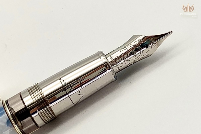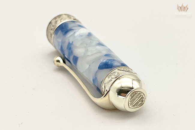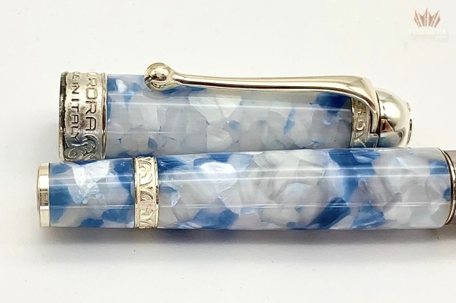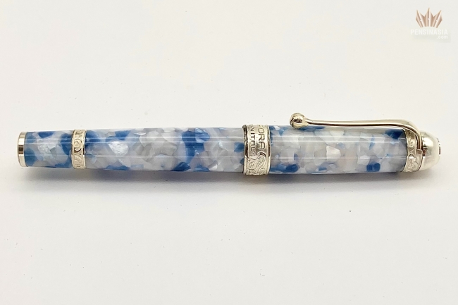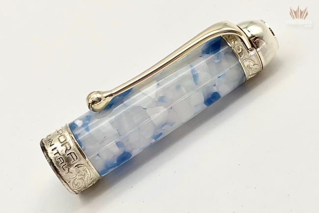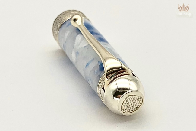 Cap and barrel in light-blue and white Auroloide marbled, sterling silver trims. Special engraving on sterling silver section grip. The perfume inspired by the notes of the Glacier has been vaporized on the elegant paper booklet. Casting sterling silver ring.