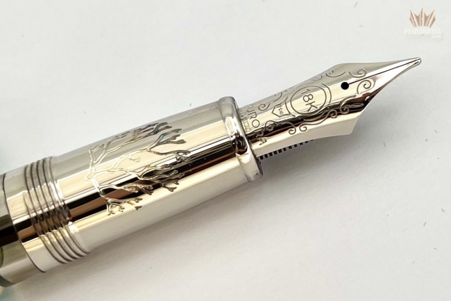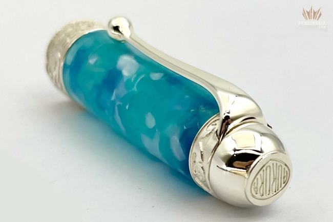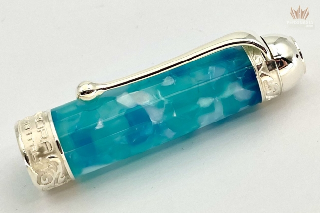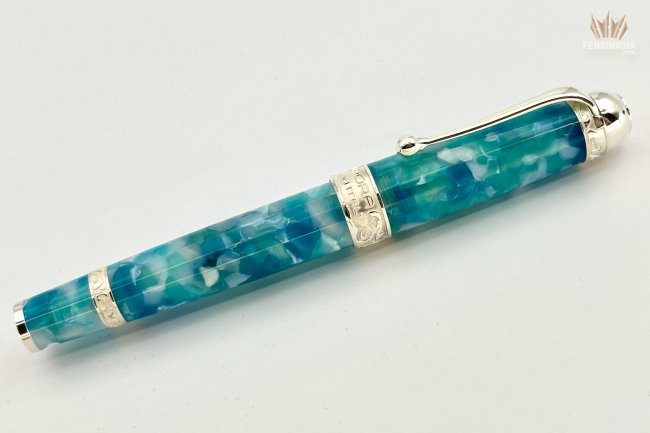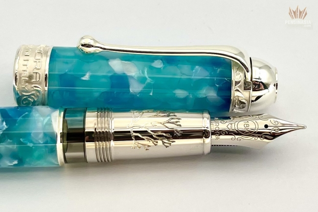 The fourth Ambiente, that means environment, is Tropici. The fountain pen, made with light blue and aquamarine Auroloide, features metallic parts in sterling silver. On the grip zone there's an exclusive engraving who made special the Aurora Ambienti Tropici.