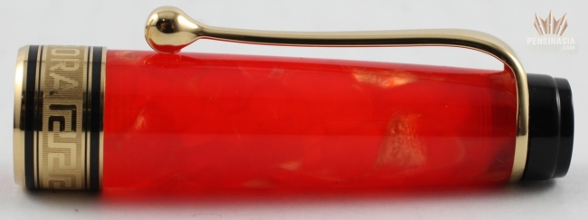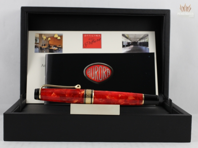 Aurora Optima 2019 Limited Edition Coral Red Fountain Pen is the latest in Aurora's 365 series of limited editions. Barrel and cap are made from Coral Red Auroloide with the nib section and cap flat top in resin and gold plated trim It features Aurora’s unique piston filler system with a built-in ink reserve and a 18k gold nib It is limited to 365 pieces.