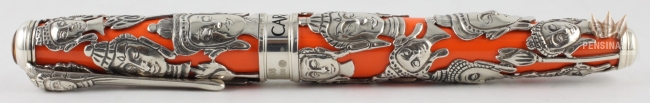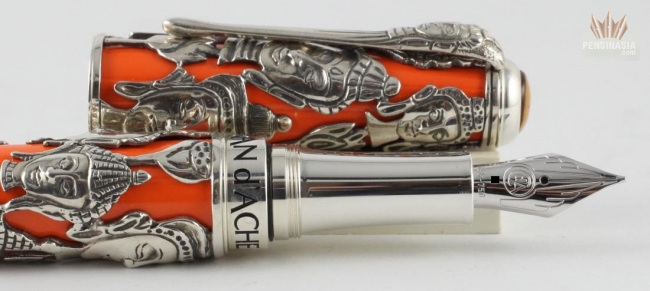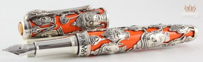 The 2013 Caran d'Arche Buddha Limited Edition Pen's barrel and cap are crafted finished with brilliant saffron lacquer, but the trimming are made with solid 800 sterling silver.