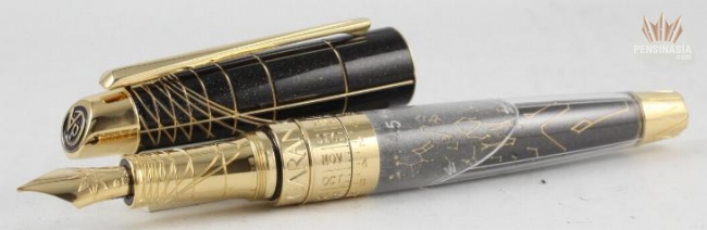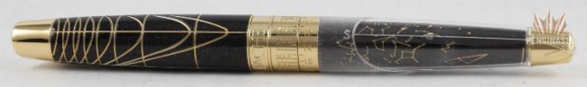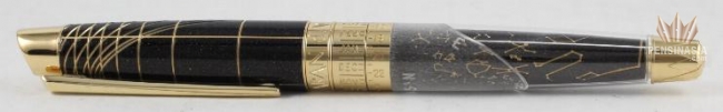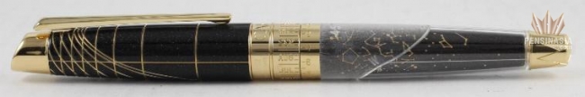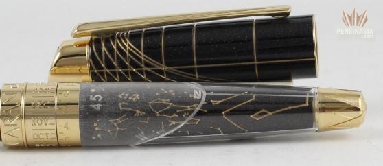 As an instrument for writing and for observation, the Caelograph symbolises the union of arts and science, of man and the stars. With a name that litterally means 'Write the sky' its ingenious mechanism allows you to see the position of the stars and the constellations at any given time, on any date. The Caelograph features a chart of the sky that is delicately engraved on the night blue Chinese lacquer decorated with silver particles. The grooves on the cap and the writing clock are the hour lines typically found on sun dials. The pen's tip is embellished with a compass rose while the clip takes the form of a compass needle, evoking the ageless link between navigation and astronomy. The Caelograph Sirius Edition Fountain Pen is gold plated and features a single diamond on the Sirius star and is set to the latitude of 45 degrees north.