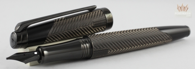 A Special Edition Non-Numbered Fountain Pen from Caran d'Ache for the Justice League movie, representing the dark hero, Batman. Each detail is inspired by Batman’s costume. The pen features a combination of cutter-engraved patterning with chevron pattern on the brass body and cap finished in a translucent satin black lacquer to represent his armour. The nib is 18-carat gold, PVD (physical vapour deposition) coated with a black ceramic finish which ensures optimum adherence of the material. The ceramic is non-corrodible and extremely resistant to friction. The ends of the cap and body are smooth and coated in black satin-finish lacquer. The cap button carrying the new Caran d’Ache identification (grey-black lacquered hexagon).