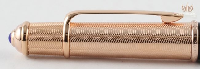 Cartier Diabolo Guilloché Ball Pen with black composite body and pink gold finish cap and details with blue resin cabochon.