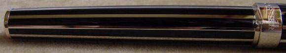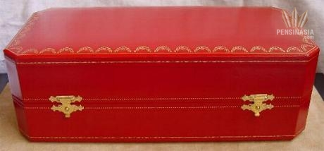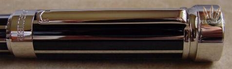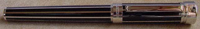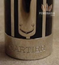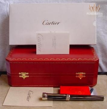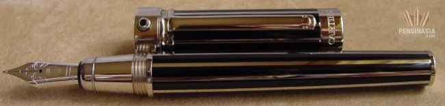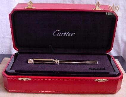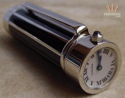 This magnificent limited edition fountain pen by Cartier in black lacquer and platimum plate, the cap top set with a timepiece signed 'Cartier' on the Roman dial. Each piece is serial numbered and comes with a certificate and beautiful traditional Cartier presentation box.