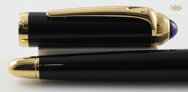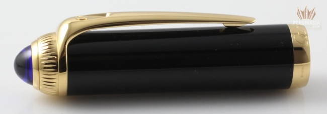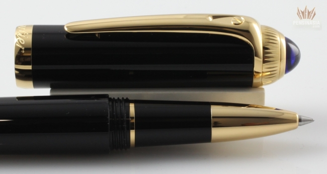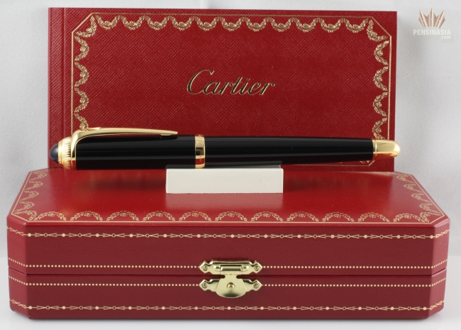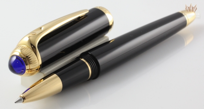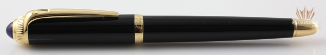 Cartier de Roadster Designed with the power and beauty of a classic touring automobile as inspiration, the Cartier Roadster collection exudes the essence of the Cartier brand. With black composite body and cap with gold finish, a blue cabochon on the cap, and a generous oversize clip, the Roadster offers a unique look which is sure to impress. Available in ballpoint, rollerball, and fountain pen. Fountain pen is cartridge/converter style and has 18k gold nib with a unique engraving specific to this model