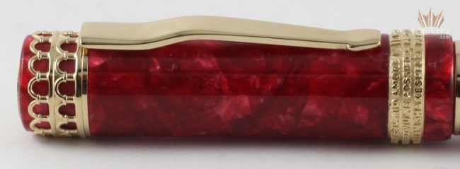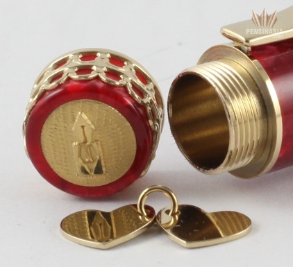 The scarlet red Italian resin was chosen to evoke the red ammonite limestone facades that can be seen in Verona. The heavy gold plated accents and the two-tones 18K Fusion nib found on the lever-fill fountain pen. Also available is a matching capped rollerball and a twist action ballpoint. All pieces are individually numbered, feature a pair of golden metal heart charms inside the cap and have the familiar Delta logo cast in a coin set atop the pen.