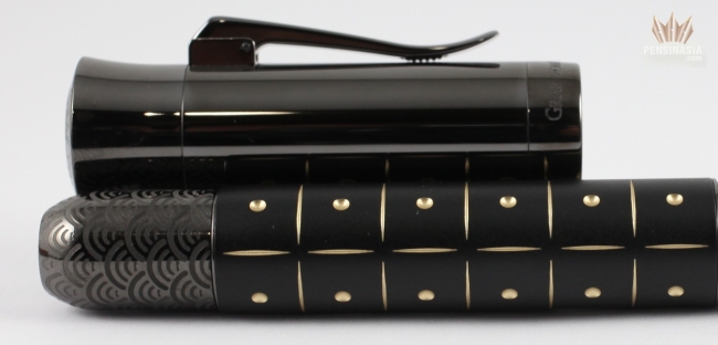 Graf von Faber-Castell Pen of the Year 2019 Samurai Black Edition Roller Ball Pen paid tribute to the noble virtues of the samurai and their art of forgery. The Samurai Black Edition has a black PVD-coated metal barrel with an engraved 24-karat gold-plated pattern running its length. The quote “Cultivate both – your spirit and wisdom” is engraved on the cap with the Japanese character for samurai. The end cap is adorned with a wave-like pattern symbol designed for the hand guard of Japanese swords.