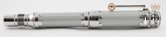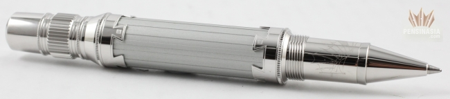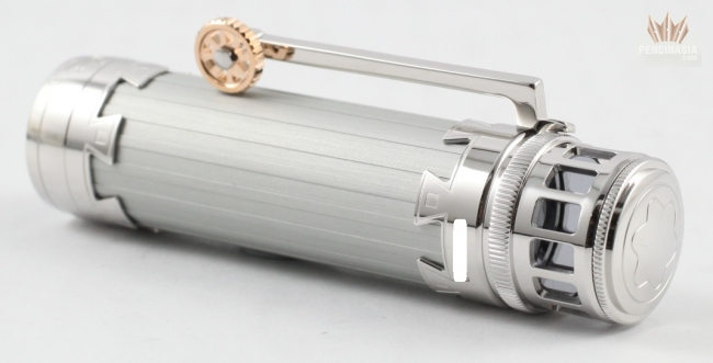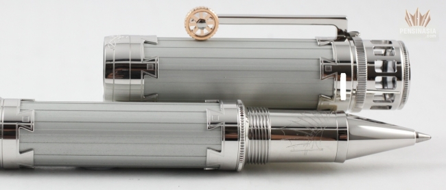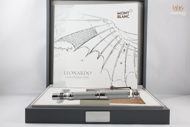 Montblanc Great Characters Leonardo Limited Editon 3000 Rollerball Pen pays homage to the famous painter Leonardo Da Vinci. This Rollerball LeGrand is crafted in a silver-colored, anodized cap and barrel with platinum-plated fittings. This exquisite creation carries details that symbolize the innovations of Da Vinci like the brand's star logo on the cap top is shown in a hidden mirror, which is inspired by the artist's study on convex surfaces.
