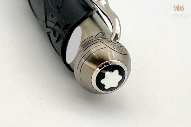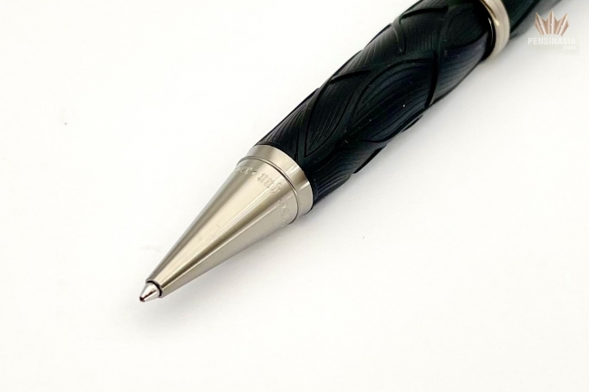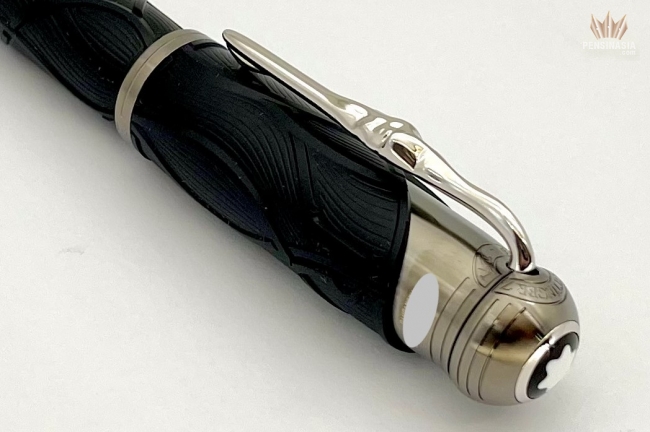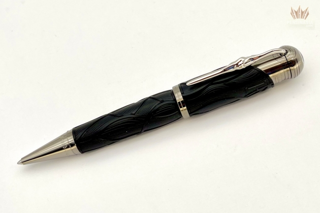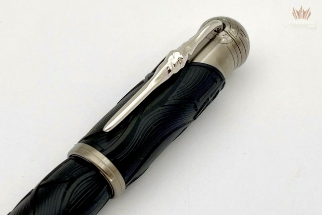 "Once upon a time..." The Montblanc Writers Edition Homage to the Brothers Grimm is dedicated to Jacob and Wilhelm Grimm and celebrates their work on German and European folktales, among which are some of the most famous fairy tales such as "Snow White", "Cinderella" and "Sleeping Beauty". The overall silhouette of the writing instrument is shaped like an old hiking stick, while the black color resembles the darkness of the woods which usually serve as the main stage for the Brothers Grimm’s folklore. In addition, the wave-like pattern on the cap and barrel is inspired by Rapunzel’s hair while also resembling roots, since the Brothers Grimm viewed their linguistic work as "research into roots". The cap is crowned by the Montblanc Emblem in precious resin. The platinum-coated clip, reminiscent of a knobby piece of wood, surprisingly reveals the silhouette of the profile of the Brothers Grimm when turned. As an homage to the magic of storytelling, the handcrafted 18K solid gold nib with rhodium coating bears the flames of a fire, which was often the setting where folklore stories were passed on.