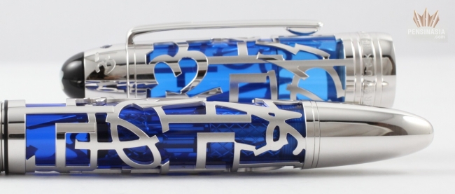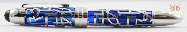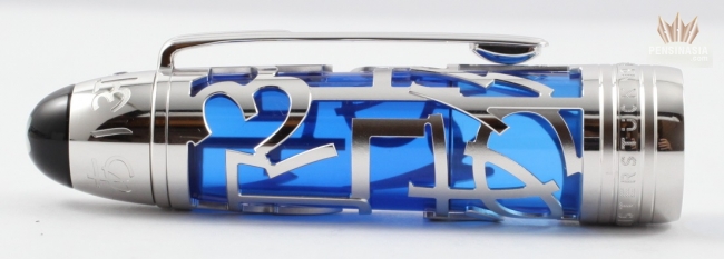 The pen has been crafted from blue precious resin featuring a brushed platinum-plated skeleton cage over the entire barrel and cap.