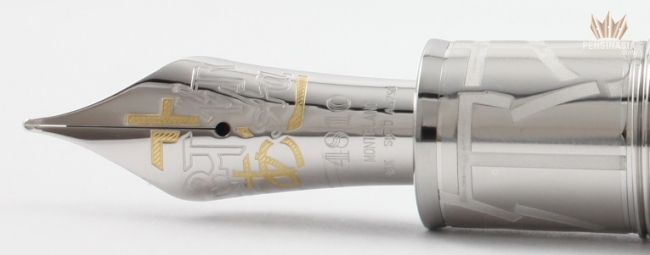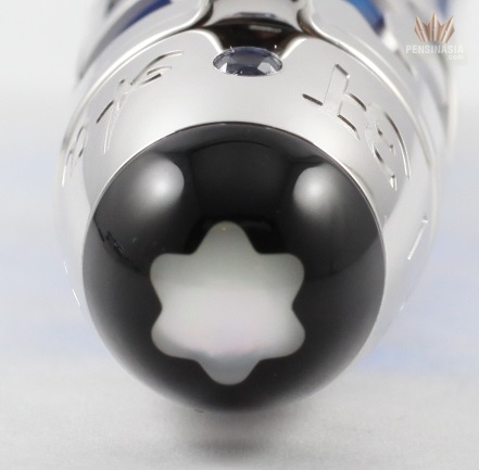 The fountain pen is a piston filling with 18K gold rhodium-plated nib and engraving of special Unicef design. The Montblanc emblem made from Mother of Pearl on top of the cap.