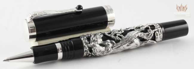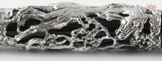 Montegrappa Horse 2014 is made in black resin and is available in two different versions. On one of the version, the cylindrical barrel is decorated with stunning die-cast overlays portray of a horse in a lifelike and lively stance in solid 18K gold or sterling silver. The cylindrical cap in black resin is fitted with a solid 18K gold or sterling silver trim, with Montegrappa's signature pocket rotating sphere clip.
