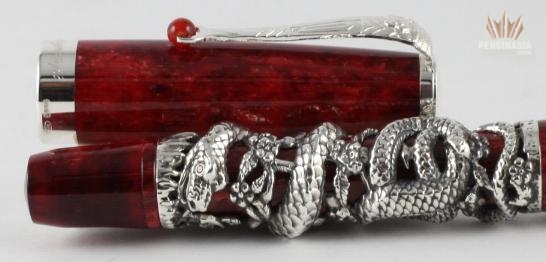 Montegrappa’s Snake 2013 Limited Edition writing instruments are decorated with stunning die-cast overlays, with special a deep red-brown hue of pearlised resin called ‘Pietra’ work with metalwork. The Snake is carved from the semi-precious stone Carnelian, in a color to match the cap and barrel, which according to the Chinese Horoscope is a symbol of wealth and good luck charm.
