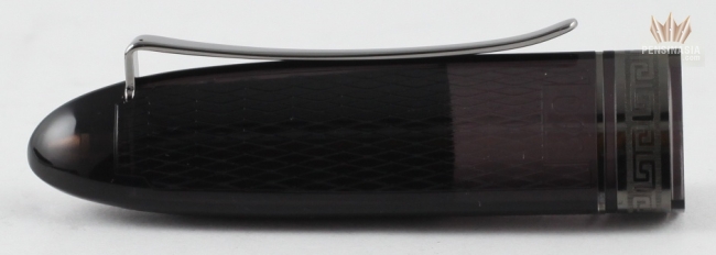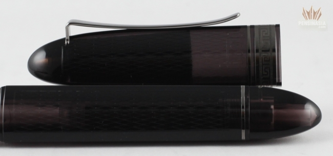 The 2013 OMAS 360 Vintage fountain pen is a limited edition. The popular triangular shape was designed in compliance with ergonomic principles. This pen is made of a smoky cotton resin and comes with two different trims. The ruthenium trim and gold trim. This Limited Edition is complimented by diamond-shaped engravings on both cap and barrel and was made from high quality Italian translucent resin. The internal piston mechanism and the ink chamber can be seen when light hits the pen. The cap has a inner sleeve at the upper end of the cap and is visible through the cap. It helps to protect the ink on the nib from resting on the resin of the cap.