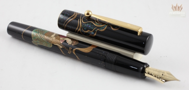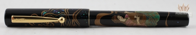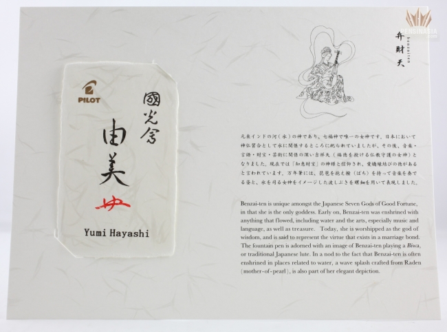 Pilot celebrated 100th Anniversary with Limited Edition The Seven Gods of Good Fortune Fountain Pen. The Seven Gods of Fortune are Ebisu, Daikokuten, Bishamonten, Benzaiten, Fukurokuju, Jurojin and Hoteison. The Benzaiten is only the female of the Shichi Fukujin and is originally the Hindu goddess of water. In its japanese representation, she is the Goddess of Arts and Knowledge. Her common form is a beautiful woman dressed in a flowing Chinese-style dress and playing the biwa, sometimes the flute. The virtue she represents is Joy.