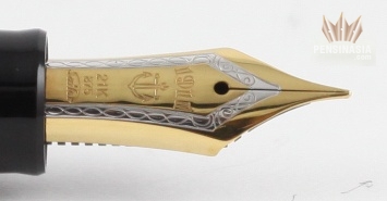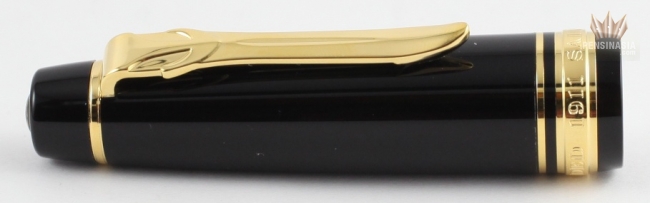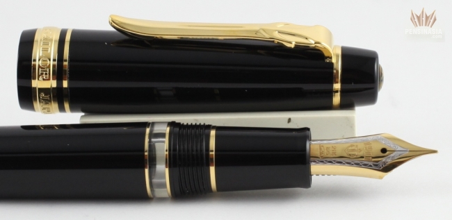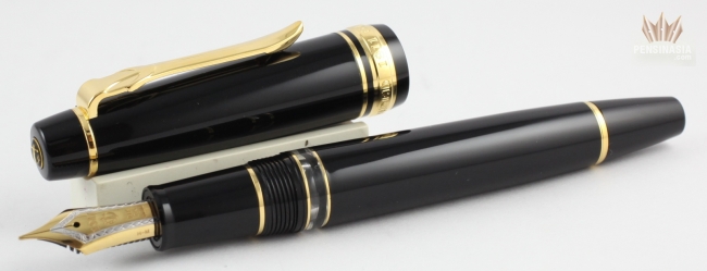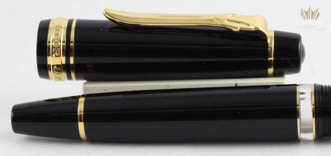 Sailor's new Pro Gear II Black with Gold Trim or Rhodium Trim or Matte Black with rhodium trim is slightly larger size than the normal Professional Gear with a raised logo on top, which gives more of a domed effect. This one is with a stylized gold Sailor anchor front and center.