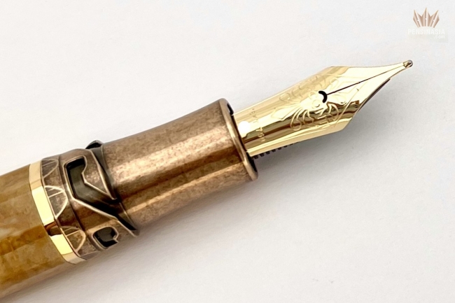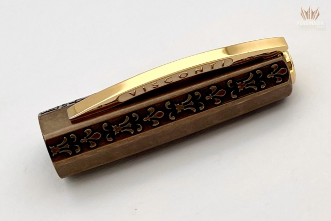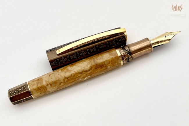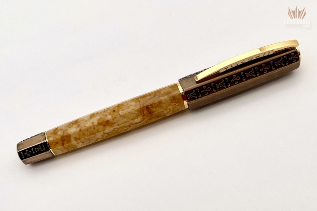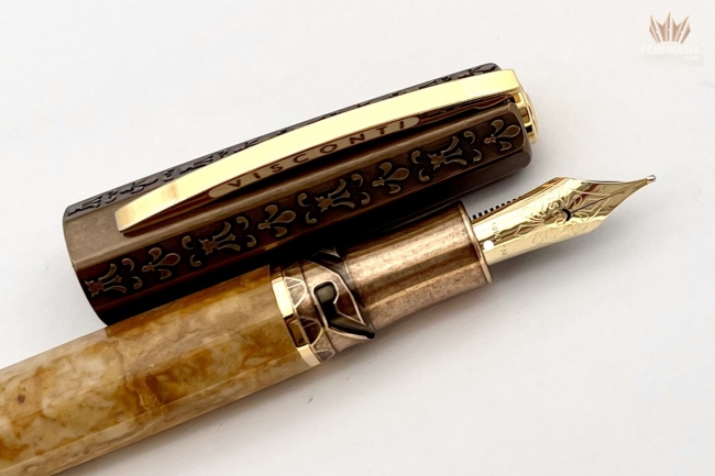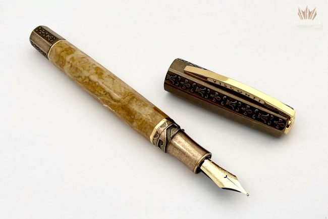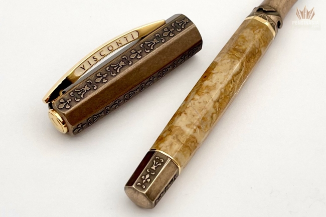 The cap and blind cap of the pen are made of bronze and are decorated with engravings of the Lily of Florence, the symbol of the Medici ruler’s coat of arms during the Renaissance. This pen is not only a tribute to that magnificent period, but also a cultural nod to the extraordinary Egyptian marble which was employed in many beautiful Renaissance and Baroque inlaid works of art in Italy. The barrel’s irregular golden-yellow pattern comes from deposits of minerals that existed in the limestone before it was affected by extreme heat and pressure from the earth’s crust.