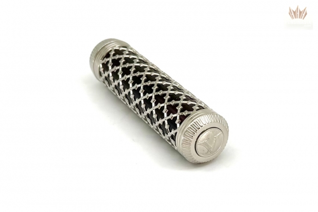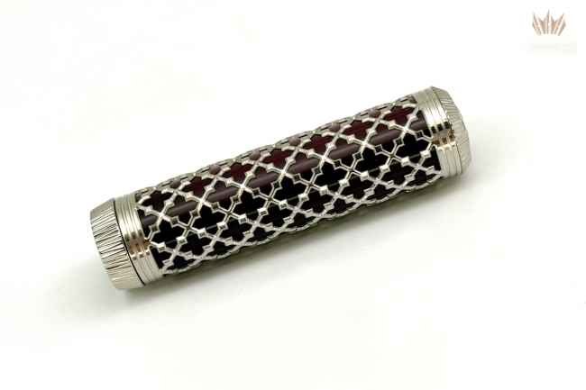 An intricate sterling silver filigree overlay recalls the ornate Gothic façades of Venetian palazzi, while beneath it glows a luminous burgundy iridescent resin, rich, velvety, and alive with shifting depth. At the finial, the engraved Lion of Saint Mark stands as a symbol of strength and heritage, anchoring the design in the city’s storied past.